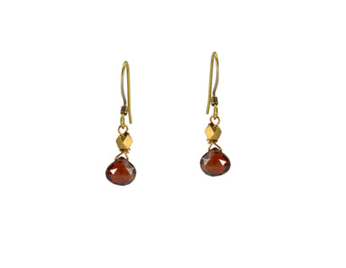 From EDGY PETAL garnet with faceted brass bead earrings. 7mm garnet stones. Raw brass elements. 1 inch drop from top. Made in the USA.
