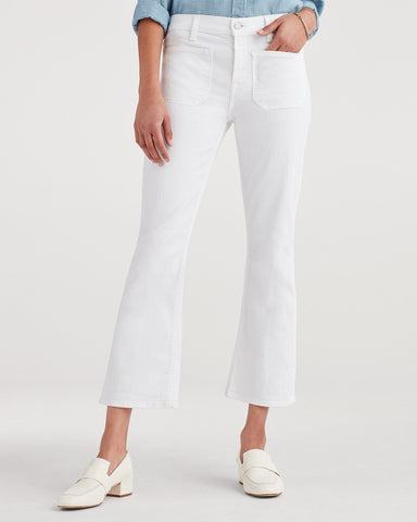 Chambray side stripes make a sporty-chic statement on bright white jeans that hug your figure from the high waist to the ankle-length hems. FI...