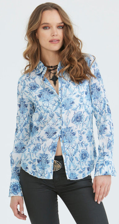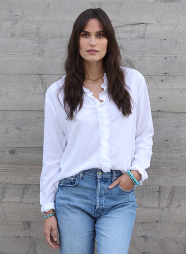 Delicate details define this long sleeve shirt, featuring a shirred yoke and soft neck ruffle for a touch of romance. Designed with a feminine, ele...