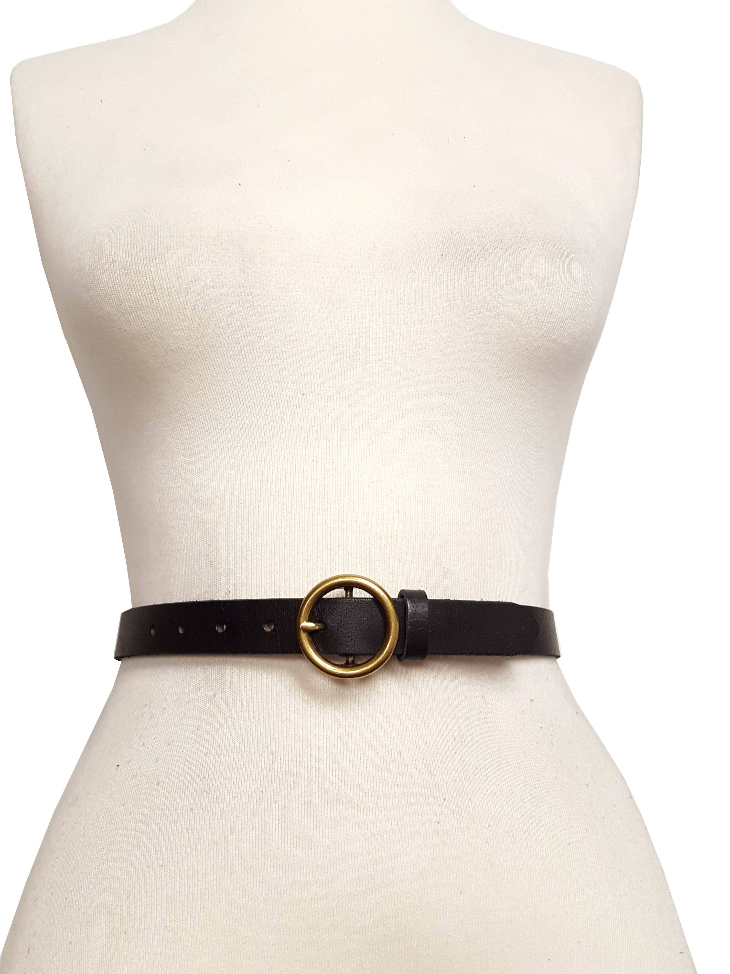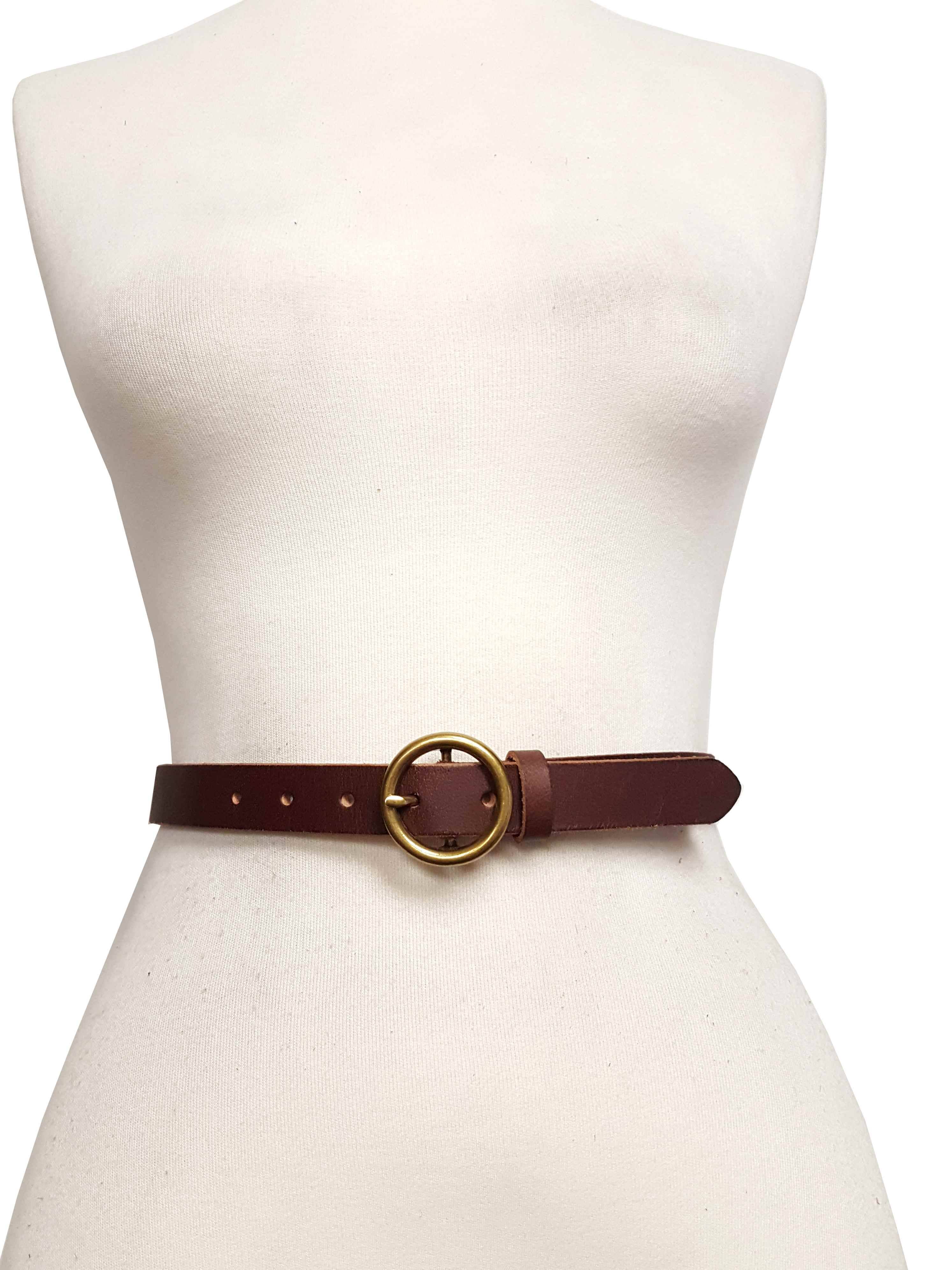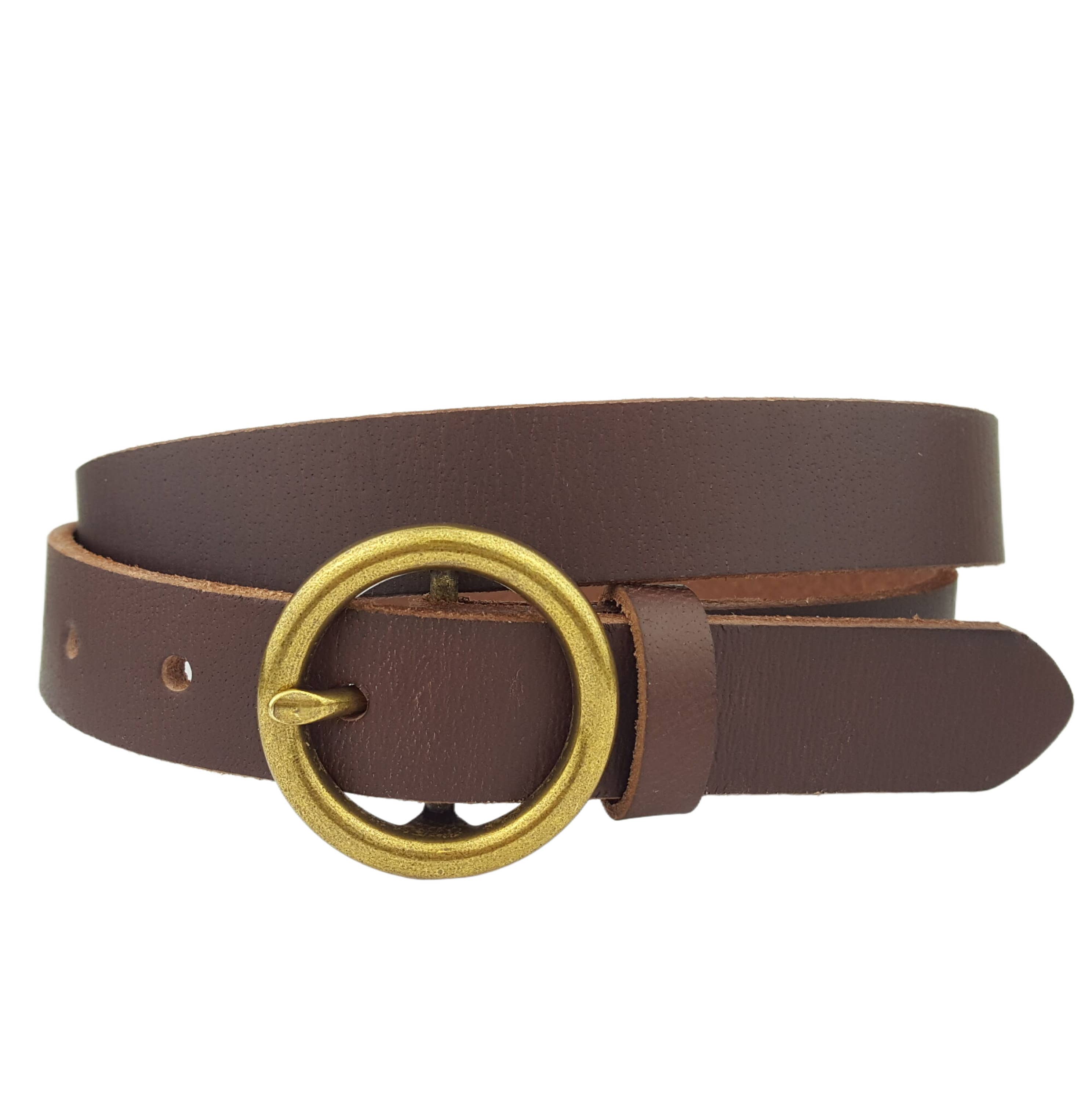Genuine Leather Skinny Belt with Round Brass Buckle