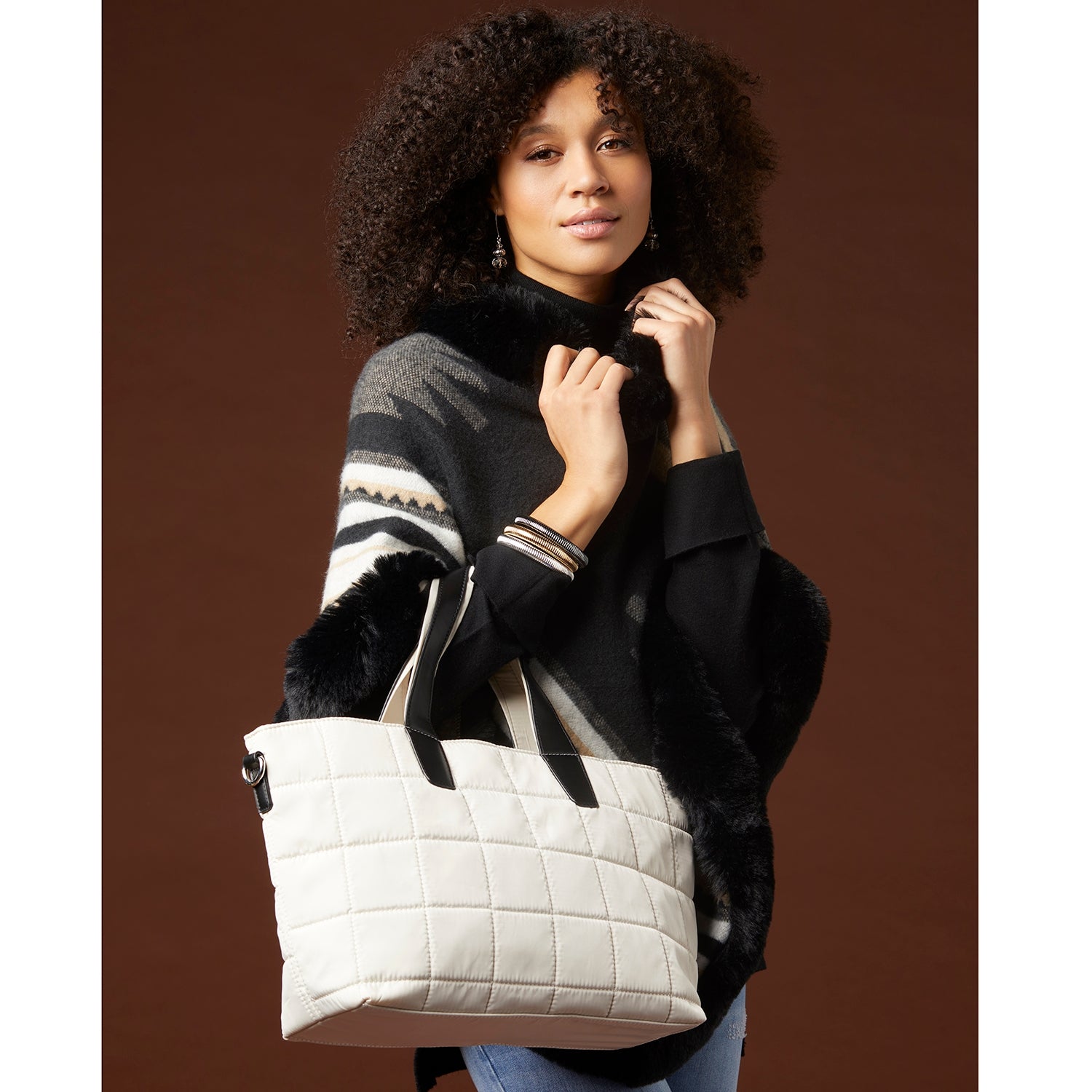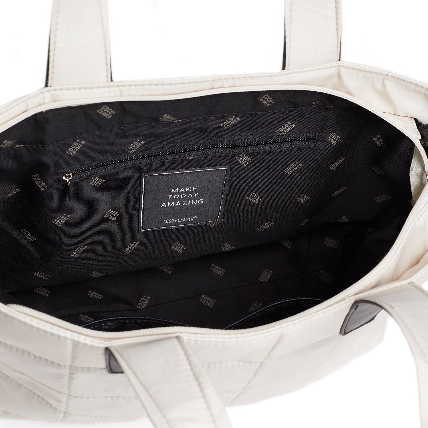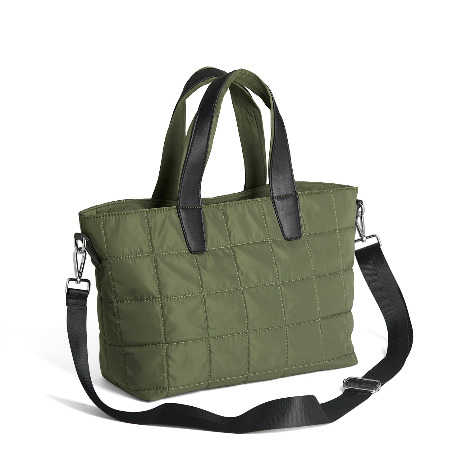 Luxe nylon bag with quilted puffer squares, dual top handles accented with vegan leather, spacious interior, detachable strap and silver metal hardware.
