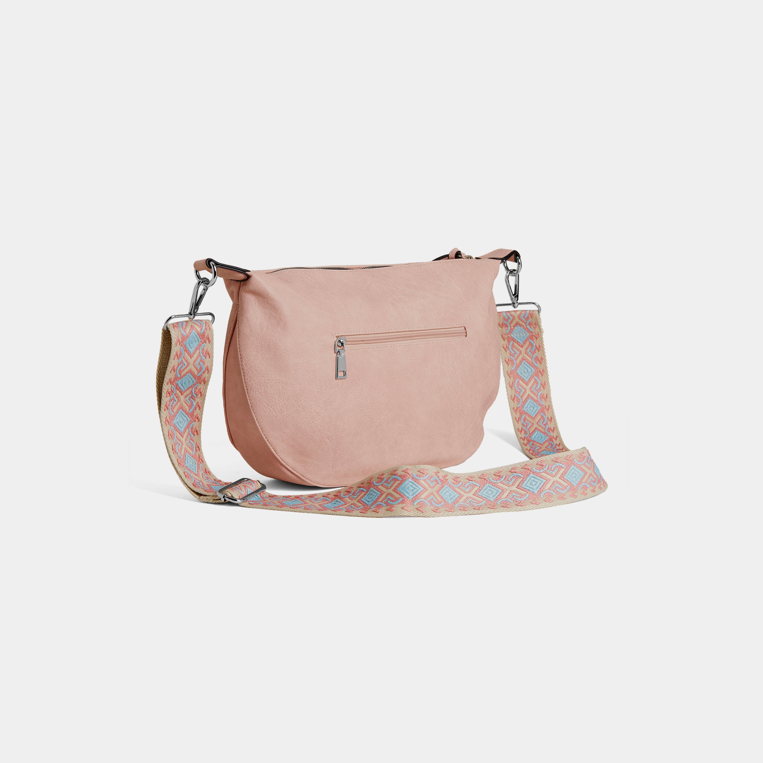 Soft and spacious half moon messenger bag, top zip, interior zip pocket and storage compartments, woven nylon strap is adjustable/detachable, metal hardware.