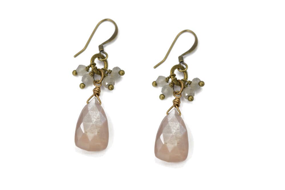 From EDGY PETAL, coffee moonstone and gray moonstone cluster earrings. A bundle of moonstone is both elevating and refreshing; Flashes of peach, brown and gray colors at every angle!