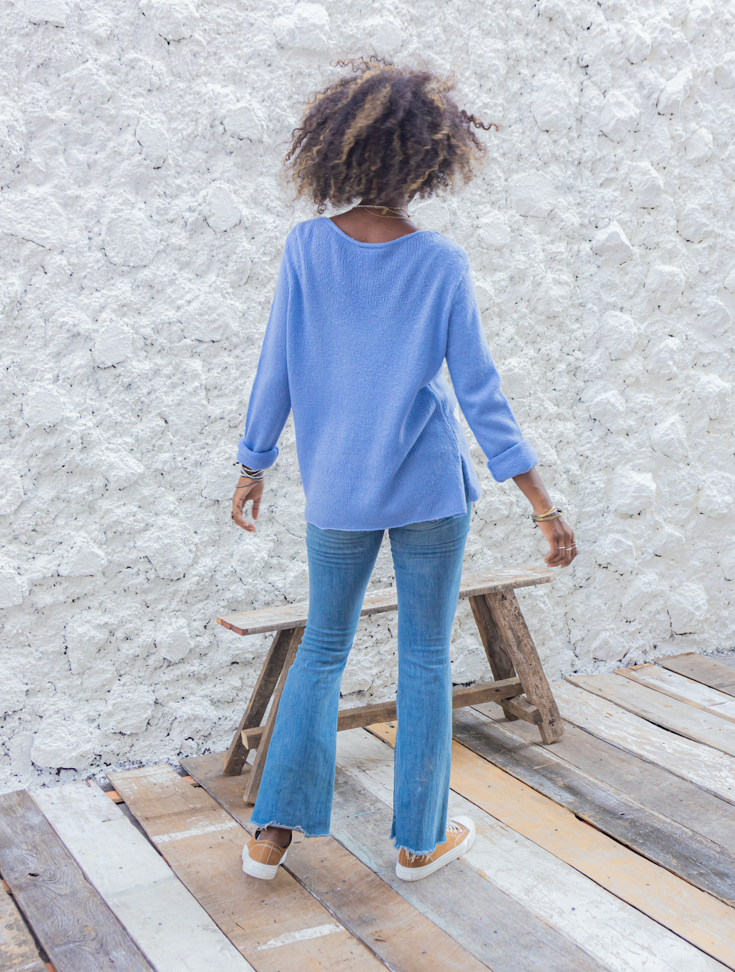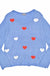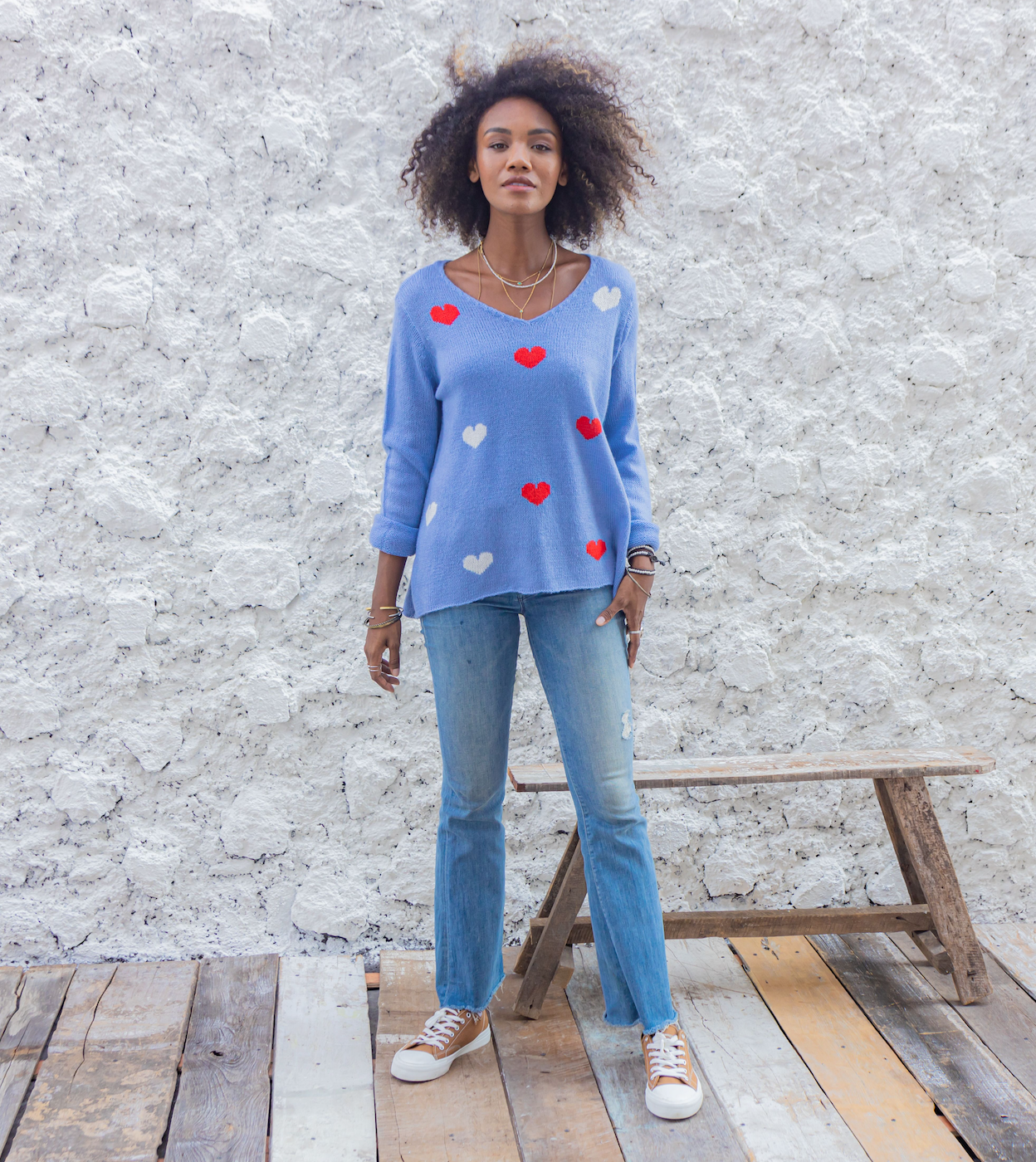 Tissue soft and lightweight vneck sweater with both red and white hearts knit directly into the front. The neckline is flattering and keeps this top feeling light and airy. Oversized, boxy fit with a fitted sleeve.