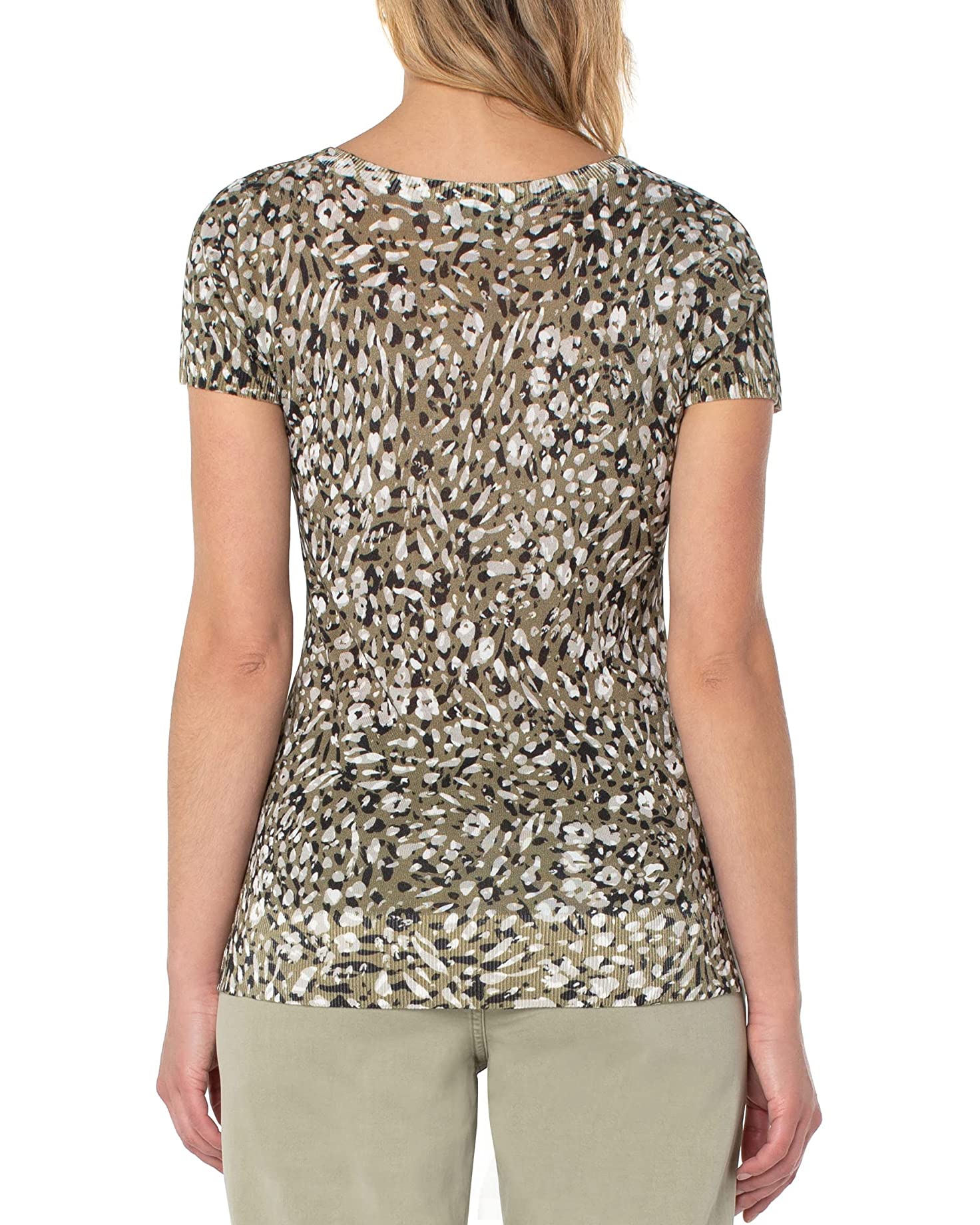 The unique short sleeve scoop neck every woman needs! Featuring a beautiful painted animal print, this knit is the perfect addition to any closet. Pairs with denim effortlessly. You could also match it with a jogger or a wide leg pant.