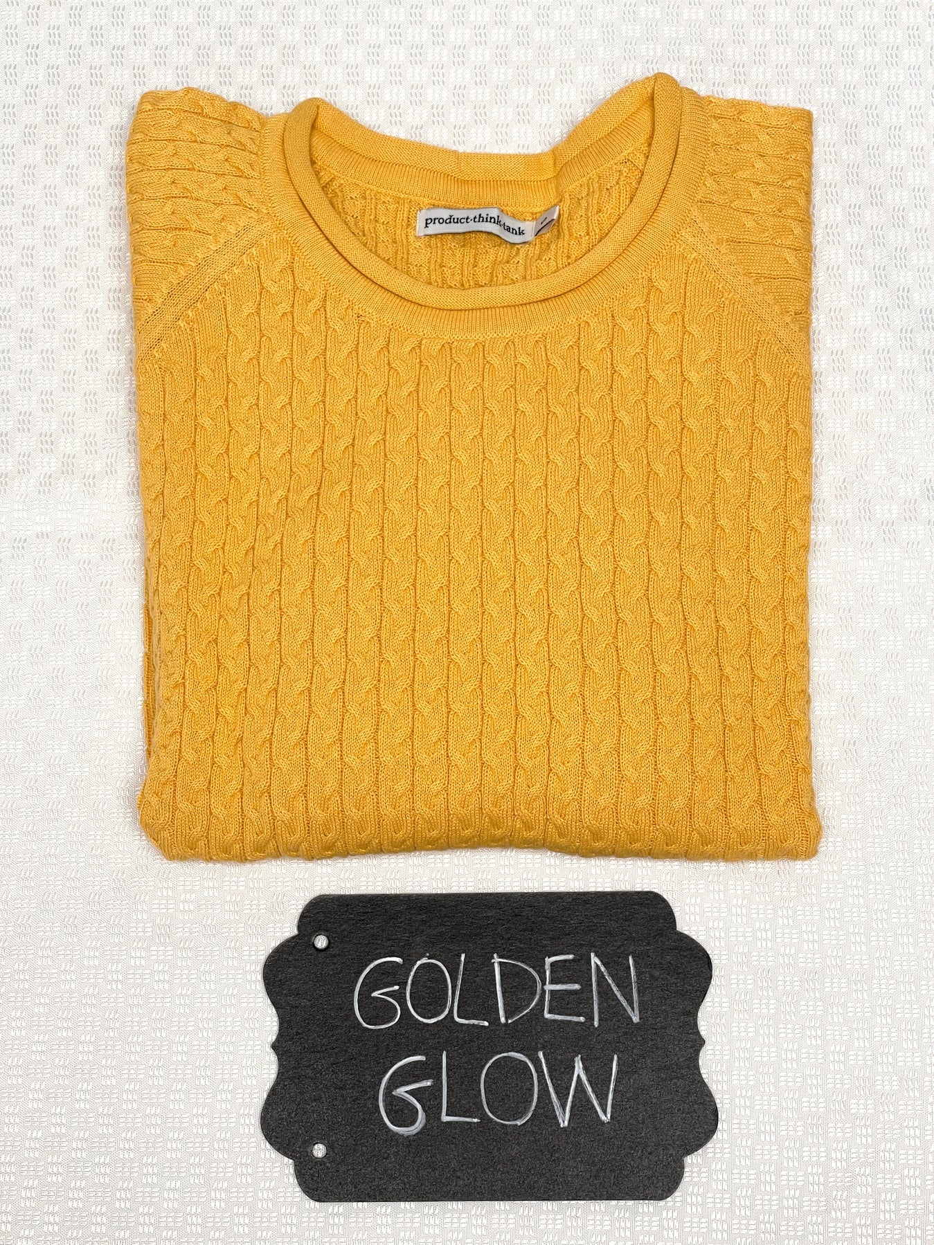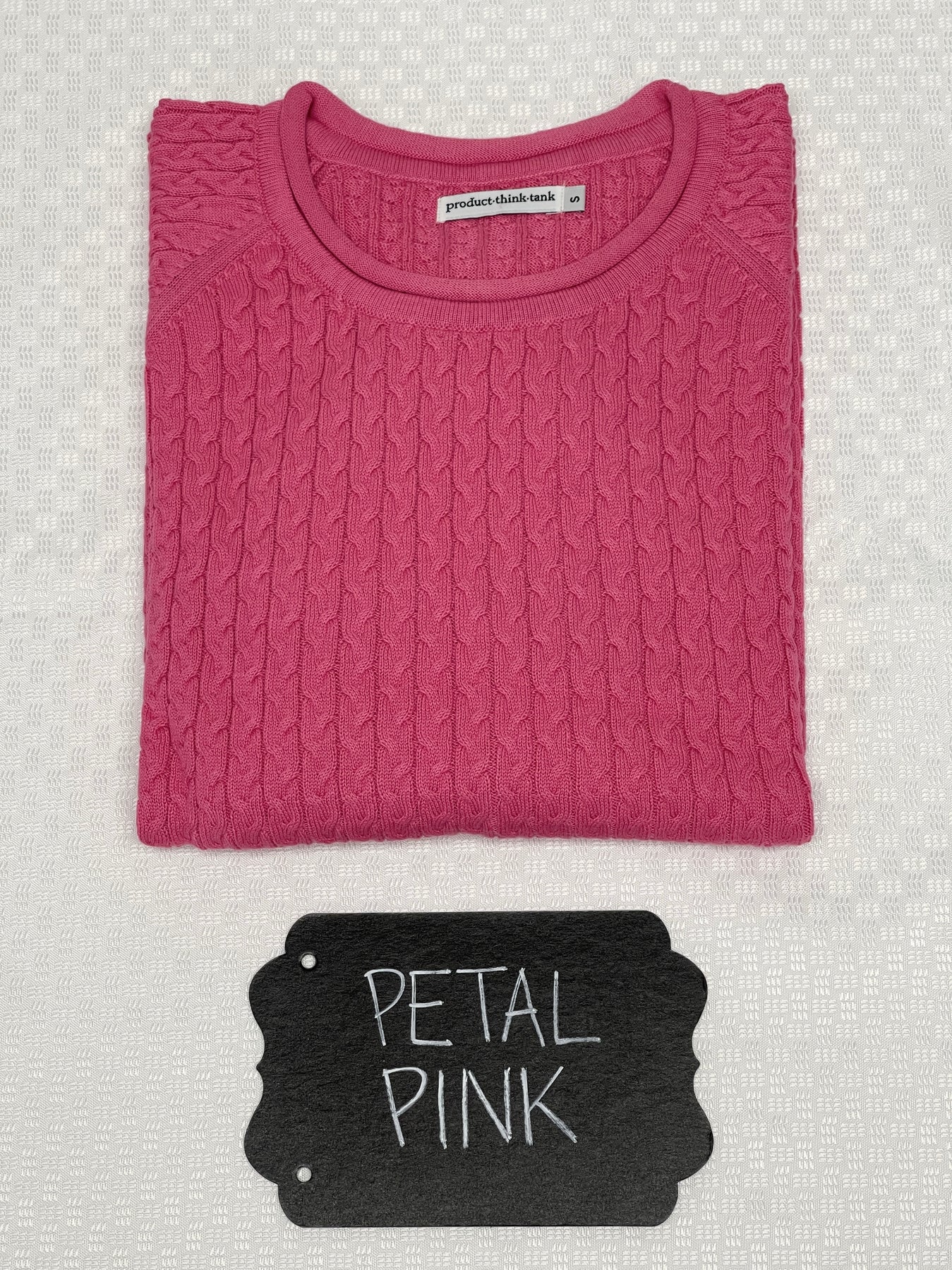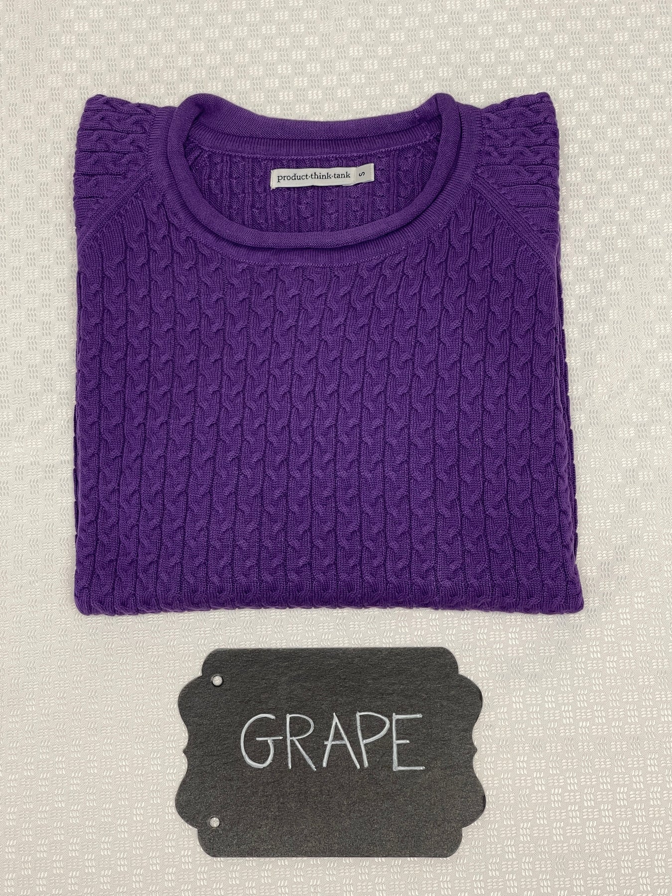 Soft and comfortable cabled crew neck sweater with rolled collar, sleeves, and bottom edge. This fine gauge sweater drapes beautifully and is a little boxy in shape so it hangs straight to easily fit over most everything. Wearable in every season!!